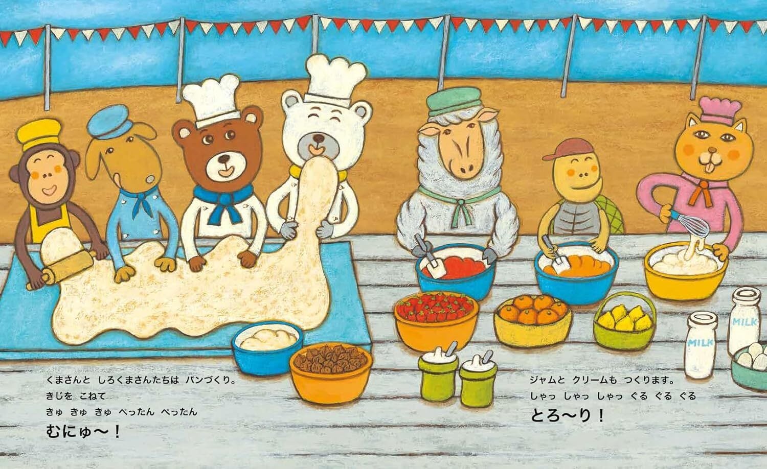 どうぶつの国では、年に一度、パンやさんが森の広場にやってきて、パンまつりを開きます。さるのパンやはバナナジャムの入ったパン、いぬのパンやはわんわんドッグと、ごじまんのパンばかり。お客さんは、木の実やくだものなどをもってきて、パンとこうかんします。たくさん材料が集まったら、広場に大きなかまがはこばれます。さて何ができるのでしょう? みんなが、もっているものを分け合い、できることをしていく優しい物語。